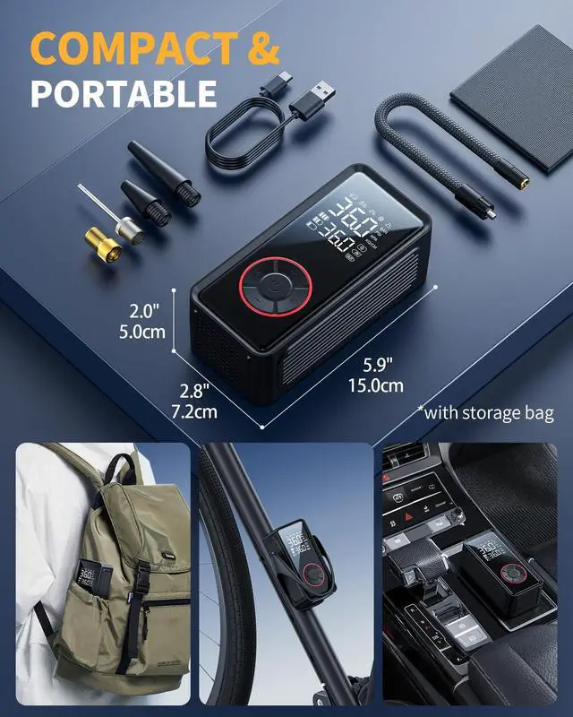 1. Compact yet powerful, this bike tire pump measures just 5.9" × 2.8" × 2.0", fitting easily into a car cup holder or backpack. Its lightweight build and 4 interchangeable nozzles make this cycling accessory an all-in-one tool for cars, motorcycles, bikes, sports balls, and swim rings. However, it's not suitable for heavy-duty tires.