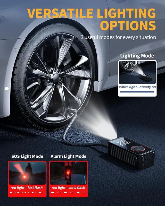 3. No need for an extra tire pressure gauge, this inflator features a bright LED screen that provides 4 pressure units for accurate readings. Its 3 lighting modeslighting, warning, and SOSoffer visibility and safety day or night.