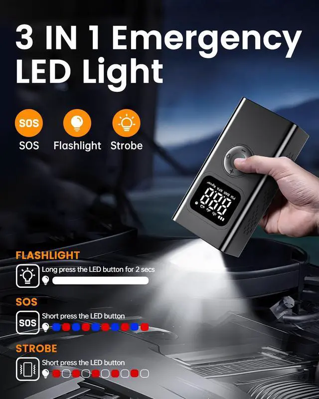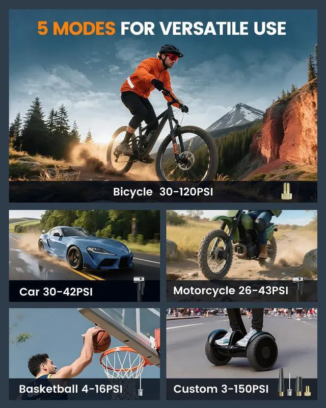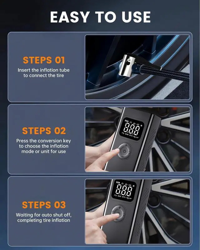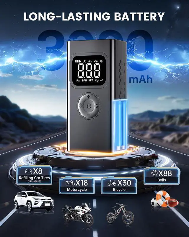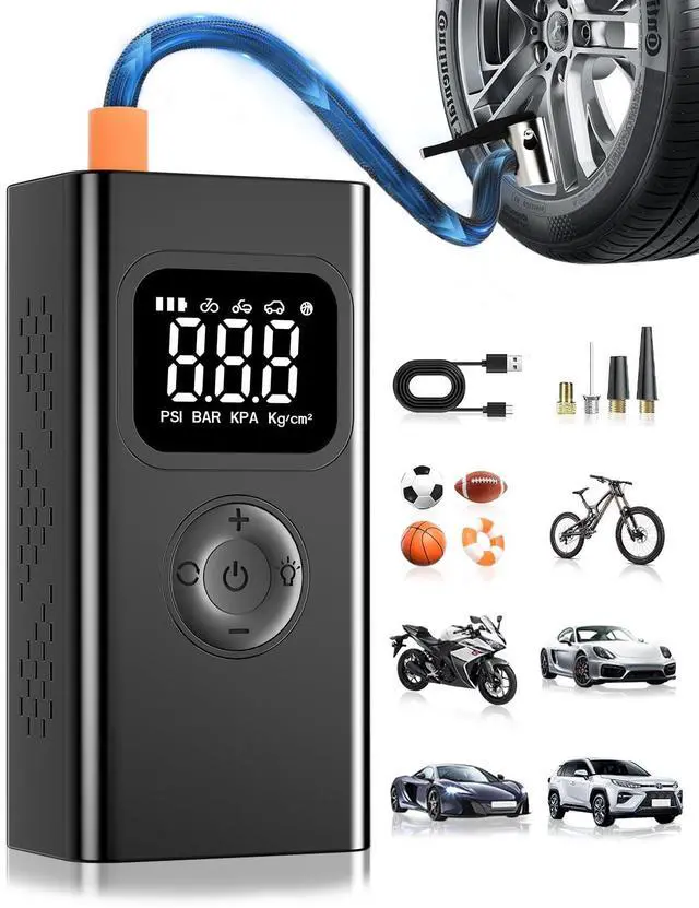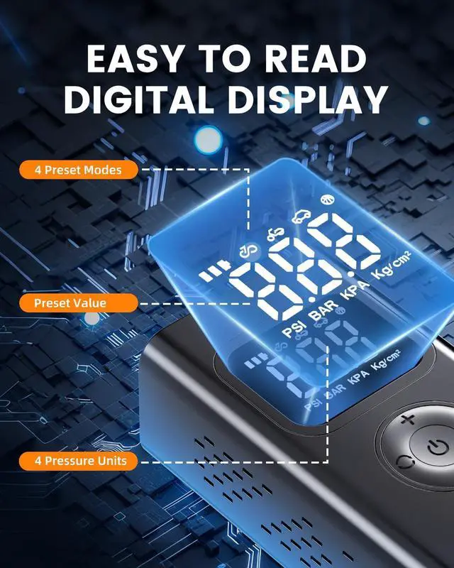 Four intelligent modes: This portable air compressor for car tires features a large digital display screen and is equipped with 4+1 intelligent modes (automobile, motorcycle, bicycle, ball games, and custom mode). It allows free switching between four pressure units (PSI, Bar, kPa, kg/cm²). The pump automatically cuts power when inflation reaches preset values, effectively preventing overinflation and short circuits, ensuring safety for you and your vehicle anytime, anywhere.