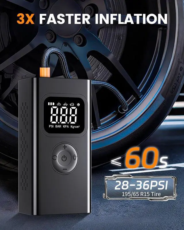 Triple-speed inflation: This portable car tire pump delivers triple-speed inflation with a maximum pressure of 150PSI. It can inflate a 195/65 R15 sedan tire from 30 PSI to 36 PSI in just 60 seconds, providing instant inflation for cars, bicycles, motorcycles, and balls. Our pump ensures worry-free travel experiences.