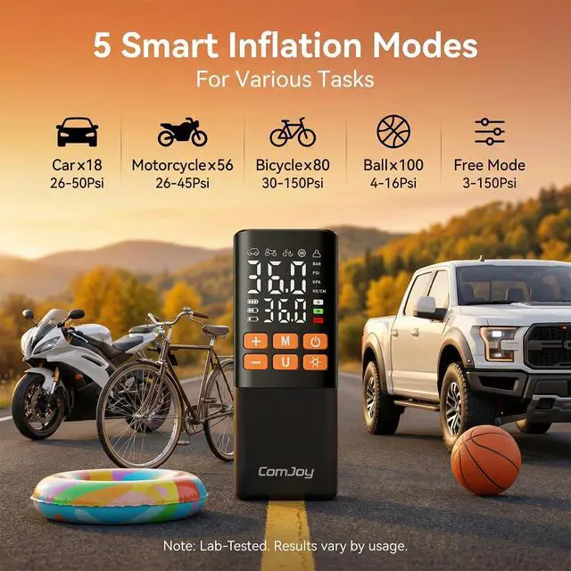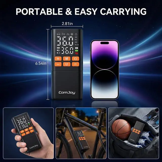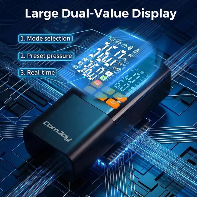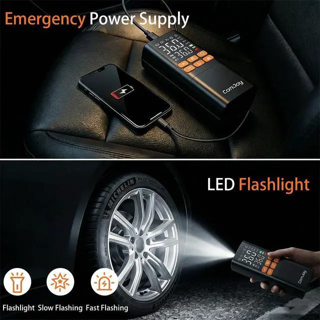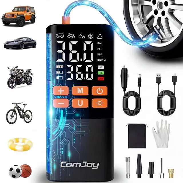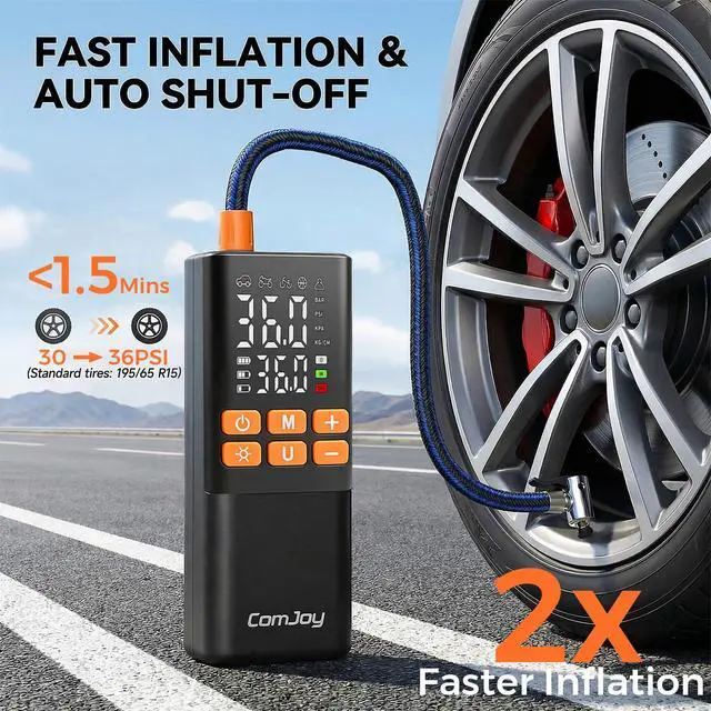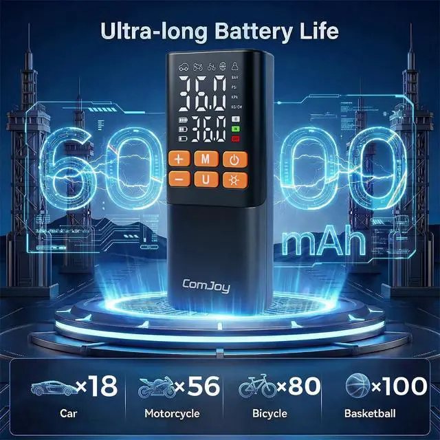 The ComJoy Portable Tire Inflator features an ultra-large 6000mAh battery capacity, providing up to 25 minutes of continuous operation. It can inflate three standard car tires (195/65 R15) in a single session, without any interruptions or waiting.