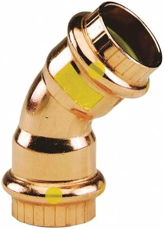 Crimp Elbow Fitting, Application Potable Water, Fitting Side A Connection Type Press-Fit, Fitting Side B Connection Type Press-Fit, Fitting Side A Copper Tube Size 1 in, Fitting Side B Copper Tube Size 1 in, Fitting Material Copper, O-Ring Material EPDM, Specific Fitting Shape 45 Degrees Elbow, Number of Bolt Holes Not Applicable, Flange Thickness Not Applicable, Maximum Operating Pressure 200 psi, Maximum Operating Temperature 250 Degrees F, Standards ASTM B75, ASTM B88. This item has been restricted from sale in the following state (s): []
