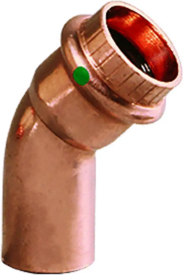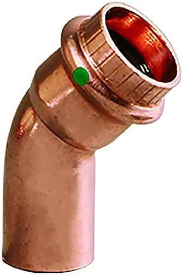 Crimp Elbow Fitting, Application Potable Water, Fitting Side A Connection Type Press-Fit, Fitting Side B Connection Type FTG, Fitting Side A Copper Tube Size 1 1/2 in, Fitting Side B Copper Tube Size 1 1/2 in, Fitting Material Copper, O-Ring Material EPDM, Specific Fitting Shape 45 Degrees Street Elbow Adapter, Number of Bolt Holes Not Applicable, Flange Thickness Not Applicable, Maximum Operating Pressure 200 psi, Maximum Operating Temperature 250 Degrees F, Standards ASTM B75, ASTM B88. This item has been restricted from sale in the following state (s): []