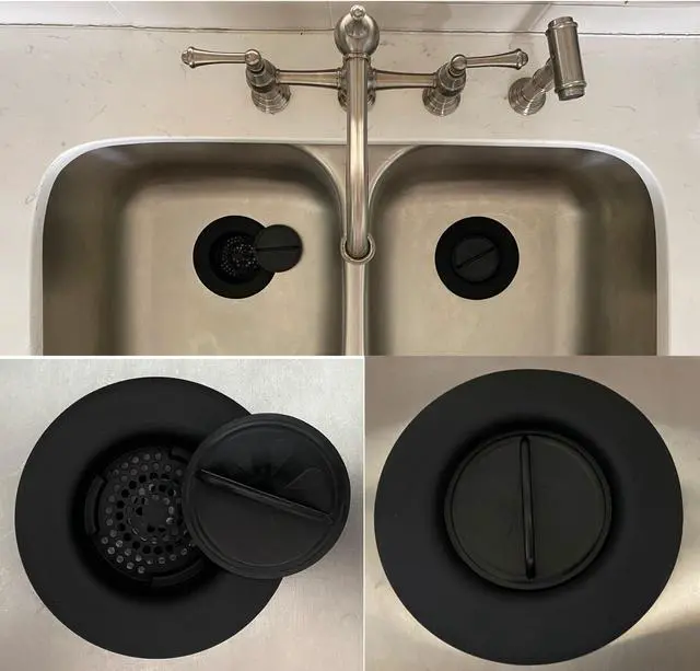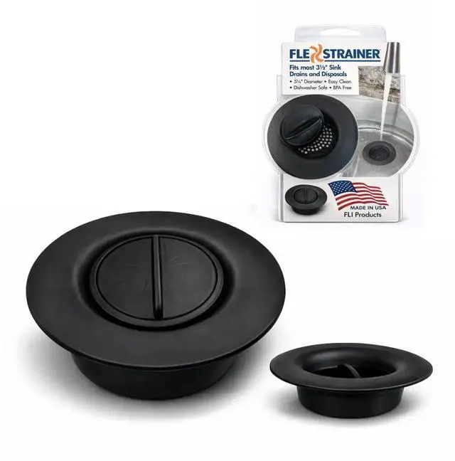 For 2 stage draining, place cap over the drain for slow drain, or press and turn for no drain. Fits all standard 3.5 sink and disposal drains. Replaces the typical cheap chrome strainers. It's easy to use and clean; simply turn it inside out over the trash. It's dishwasher safe. The stopper really holds the water in very well. And, it looks good in your sink. The drain is made of TPM plastic, and the stopper is made of PE plastic. Both are BPA FREE. These and many other products offered from FLI Products are MADE IN THE USA.
