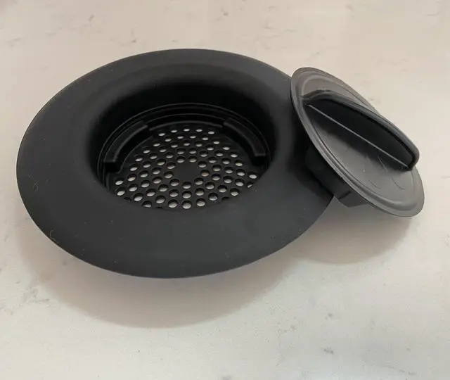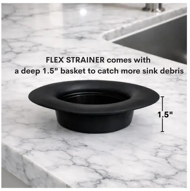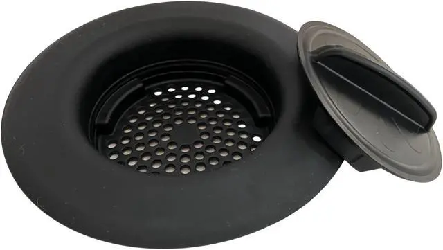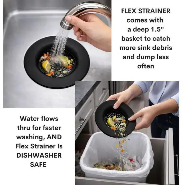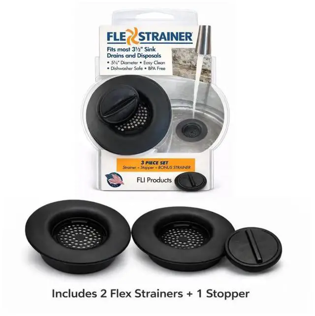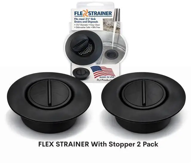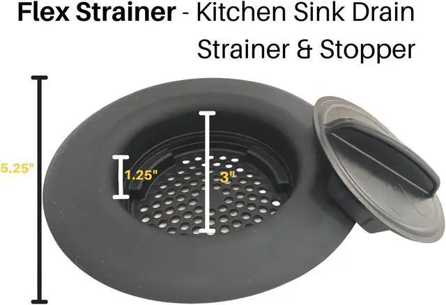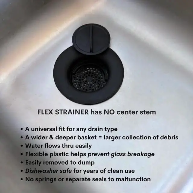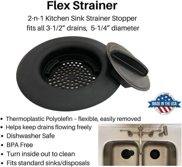 THE FLEX STRAINER 2-N-1 2 Pack kitchen sink strainer and drain stopper traps food and other debris and prevents foreign objects from slipping down the drain. Do you have a broken kitchen sink strainer, or the stopper not working? This is a perfect solution. Throw the old one out and get the Flex Strainer; you will be straining and stopping all you need! Simple replacement works by just inserting the strainer into your existing drain, press the stopper in place and twist. This strainer features a plastic stopper made of Thermoplastic Material, like rubber, for a snug fit in your drain opening.