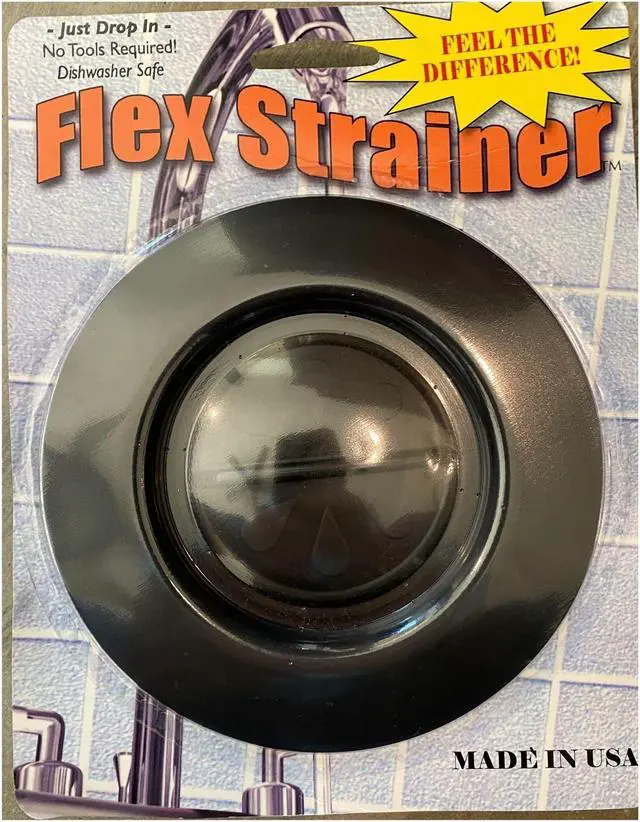 THE FLEX STRAINER 2-N-1 2 Pack kitchen sink strainer and drain stopper traps food and other debris and prevents foreign objects from slipping down the drain. Do you have a broken kitchen sink strainer, or the stopper not working? This is a perfect solution. Throw the old one out and get the Flex Strainer; you will be straining and stopping all you need! Simple replacement works by just inserting the strainer into your existing drain, press the stopper in place and twist. This strainer features a plastic stopper made of Thermoplastic Material, like rubber, for a snug fit in your drain opening.