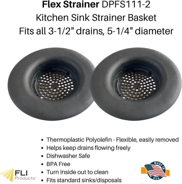 THE FLEX STRAINER kitchen sink strainer traps food and other debris and prevents foreign objects from slipping down the drain. Do you have a broken kitchen sink strainer? This is a perfect solution. Throw the old one out and get the Flex Strainer; you will be straining and stopping all you need! Simple replacement works by just inserting the strainer into your existing drain. This strainer is made of flexible Thermoplastic Material, like rubber, for a snug fit in your drain opening. Fits all standard 3.5 sink and disposal drains.