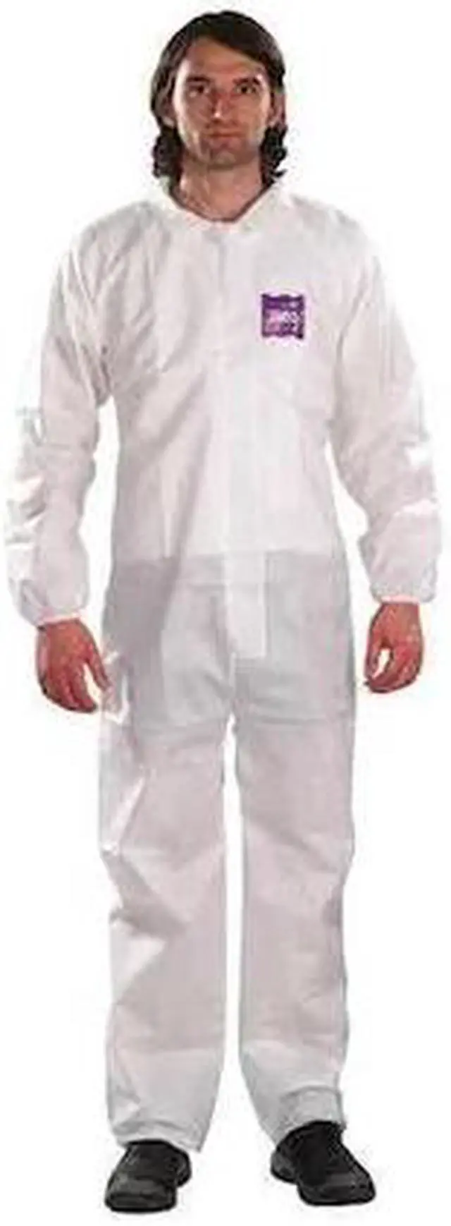 Coveralls, Ankle Closure Elastic, Anti-Static Yes, Attached Hood No, Breathable Back Style Not Applicable, Clean Process Status Not Clean Processed, Closure Features Storm Flap, Closure Type Zipper, Color White, Coverall Style Collared, Cuff Style Elastic, EPA Protection Level Not Rated, Features Proven Protection, Filters 100 Percent of Particles greater than 3 Microns, Gas Tight No, Hazard Type Non-Hazardous Dry Particulates, Height - Maximum 74 in, Height - Minimum 65 in, High-Visibility No