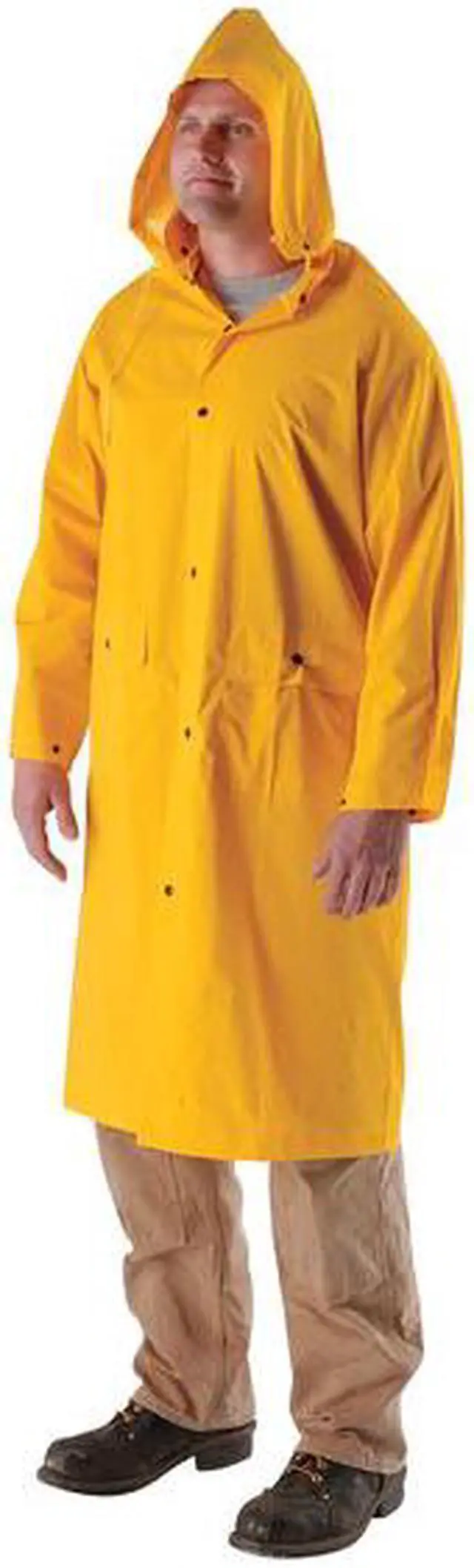 California Proposition 65: This product contains a chemical known to the State of California to cause birth defects or other reproductive harm. Rain Jacket, Style Rain Coat, Size L, Number of Inside Pockets 0, Number of Outside Pockets 2, Color Yellow, Front Closure Type Snap, Gender Unisex, Material PVC, High-Visibility No, ANSI Class Not Rated, Includes Hood Yes, Hood Style Detachable, Length 49 in, Includes Lining Yes, Maximum Chest Size 44 in, Lining Material Polyester, Features Chemical Resistant, Cuff Style Snaps, Thickness 0.35 mil, ANSI Type Unrated