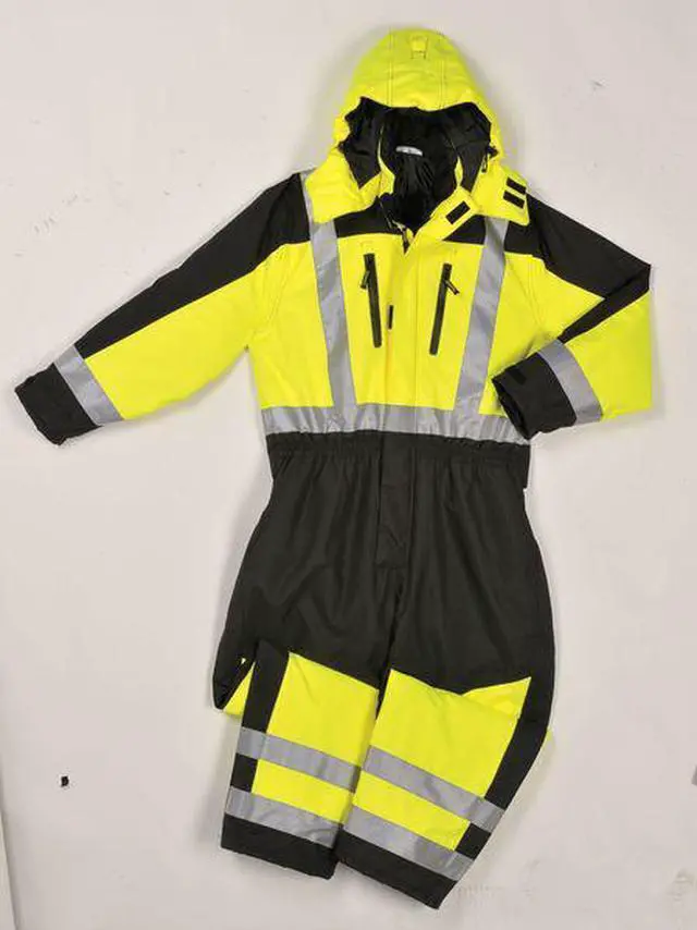 Cold Weather Coverall Rainsuit, Material Polyester, Gender Men's, Size M, Color Yellow, Inseam 30 in, Maximum Waist Size 42 in, High-Visibility Yes, ANSI Class 3, ANSI Type R, Hood Style Snap-On (Included), Number of Outside Pockets 4, Number of Inside Pockets 1, Includes Lining Yes, Lining Material Polyester, Ankle Type Elastic, Rain Prevention Garment Style Rainwear, Fabric Weight 5.9 oz, Thickness 9.8 mil, Will Fit Over Boots No, Size-Body Type Regular, Leg Fit Boot Cut, Includes Hood Yes.