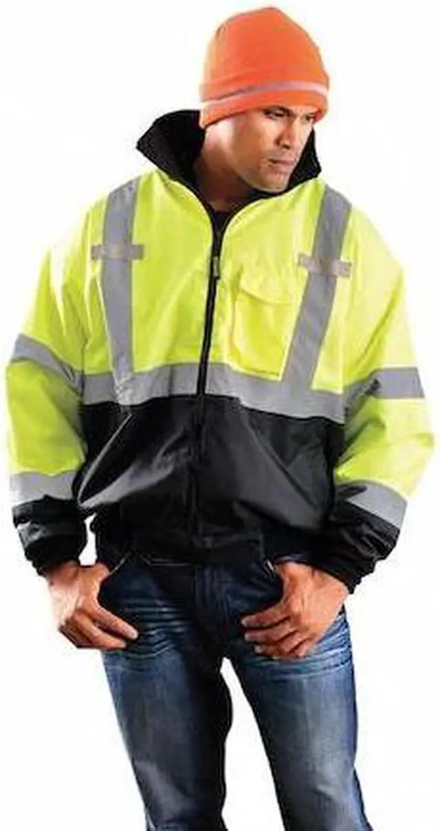 Jacket, Garment Type Jacket, Length Type Waist, Style Bomber Jacket, Back Stripe Pattern U, ANSI Class 3, ANSI Type R, Gender Men's, Front Closure Type Zipper, Color Yellow, Size 2XL, Number of Outside Pockets 5, Includes Hood Yes, Hood Style Packable Hood in Collar, Maximum Chest Size 52 in, Material Polyester, Temperature Rating 1 Degrees to 46 Degrees F, Includes Removable Liner Yes, Reflective Stripe Border Type None, Garment Features Black Bottom. This item has been restricted from sale in the following state (s): []