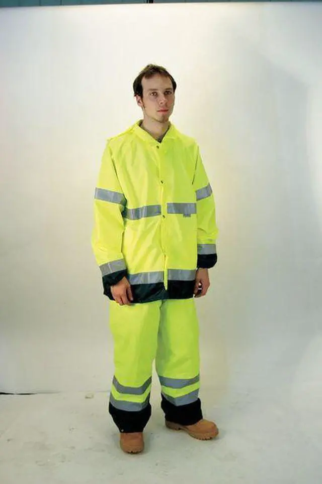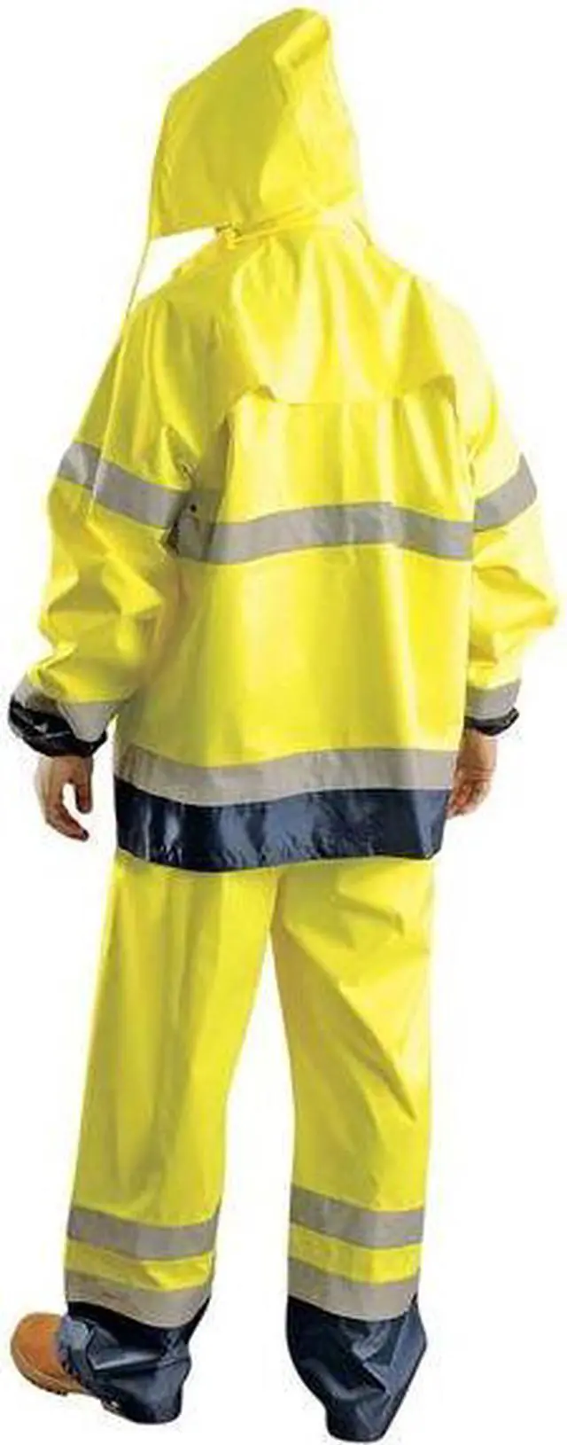 Rain Jacket with Zip Rollaway Hood, Garment Type Rain Jacket, Style Rain Jacket, Size 4XL, Number of Inside Pockets 0, Number of Outside Pockets 2, Color Yellow, Front Closure Type Zipper with Storm Flap, Gender Men's, Material Polyester, High-Visibility Yes, Insulated for Cold Conditions No, Back Stripe Pattern Horizontal, Includes Hood Yes, Hood Style Attached, Length 33 in, Length Type Hip, Includes Lining Yes, Maximum Chest Size 60 in, Lining Material Polyester. This item has been restricted from sale in the following state (s): []