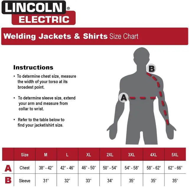 Lincoln Electric's traditional split leather-sleeved welding jacket is constructed of durable split cowhide sleeves that resist sparks and spatter and light weight 9 oz. flame retardant cotton on the chest and back for optimal coolness and breathability. This jacket features an inside pocket to protect valuables and adjustable dual snap wrists for added comfort and protection. Ideal for MIG, Stick, Flux-Core and TIG welding applications ranging from 50 to 375 amps. Available in sizes 2XS to 3XL. Size Large. Warranted against manufacturing defects. Not subject to warranty after use. Package of 1.