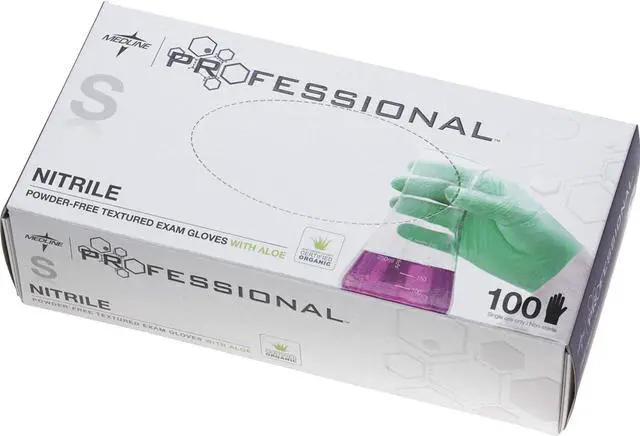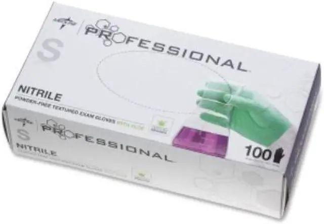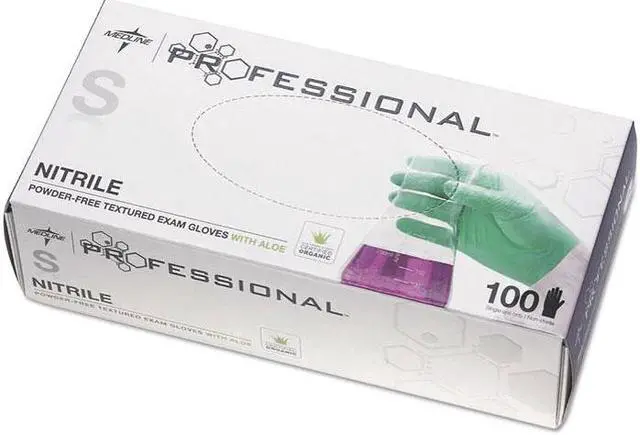 Medline Professional Series Aloetouch Gloves - Small Size - Nitrile - Green - Beaded Cuff, Latex-free, Powder-free, Non-sterile, Textured - For Laboratory Application - 100 / Box - Professional Aloetouch Gloves are designed and tested with labs and research in mind. Thick, nitrile exam gloves soothe the hands and provide exceptional protection for a range of uses for extended wear times. The aloe inner coating helps keep hands soft and smooth. All-over texturing allows a better grip on small or large items, wet or dry. Latex-free, powder-free design features a 9" cuff length, 5.9 mil fingertip and 5.5 mil palm thickness.. This item has been restricted from sale in the following state(s): []