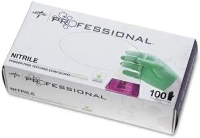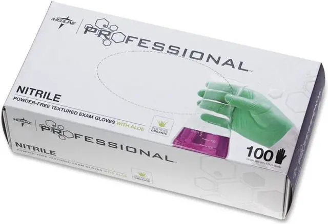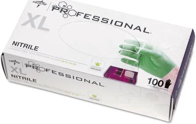 Medline Professional Series Aloetouch Gloves - X-Large Size - Nitrile - Green - Beaded Cuff, Latex-free, Powder-free, Non-sterile, Textured - For Laboratory Application - 100 / Box - Professional Aloetouch Gloves are designed and tested with labs and research in mind. Thick, nitrile exam gloves soothe the hands and provide exceptional protection for a range of uses for extended wear times. The aloe inner coating helps keep hands soft and smooth. All-over texturing allows a better grip on small or large items, wet or dry. Latex-free, powder-free design features a 9" cuff length, 5.9 mil fingertip and 5.5 mil palm thickness.. This item has been restricted from sale in the following state(s): []