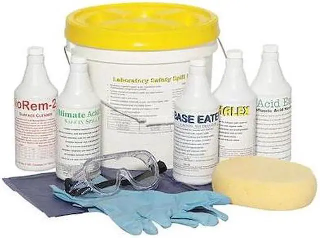 Spill Kit, Fluids Absorbed Acids, Bases, Solvents, Neutralizes Chemical Type Acids, Caustics, Halogens, Solvents, Volume Absorbed Per Kit 1 gal, Container Type Bucket, 1 1/4 gal Container Capacity, 12 in W x 12 in L x 10 in H Container Size, Black, Yellow, Filled, Sorbents Included (1) Acid Neutralizer (1 qt), (1) Base Neutralizer (1 qt), (1) Halogen Neutralizer (1 qt), (1) Hydrofluoric Neutralizer (1 qt), (1) Surface Cleaner (1 qt), (1) Sponge. This item has been restricted from sale in the following state (s): []