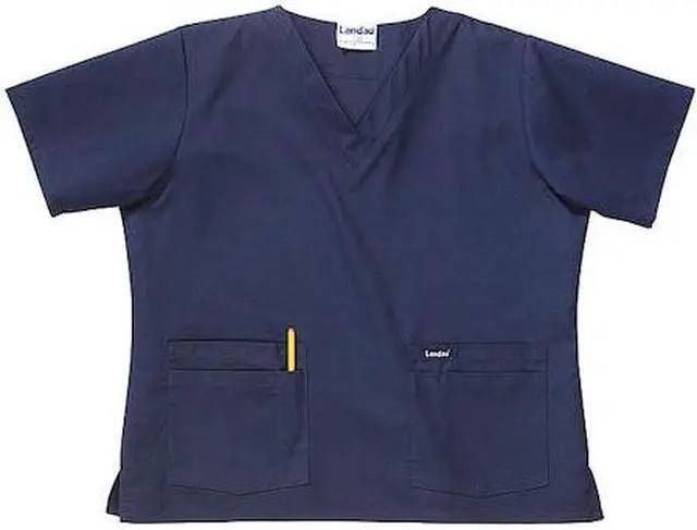 Scrub Shirt, Color Navy, Gender Women's, Material Cotton/Polyester, Size L, Style Shirt, Number of Outside Pockets 4, Reusability Reusable, Cuff Style Short Sleeve, Sleeve Type Short, Length 26 7/8 in, Front Closure Type Pullover, Maximum Chest Size 42 in, Minimum Chest Size 39 in, Collar Style V-Neck, Features (4) Pockets With Pencil/Instrument Division, 4 in Side Vents, Set-in Sleeves, Fit Relaxed Fit. This item has been restricted from sale in the following state (s): []