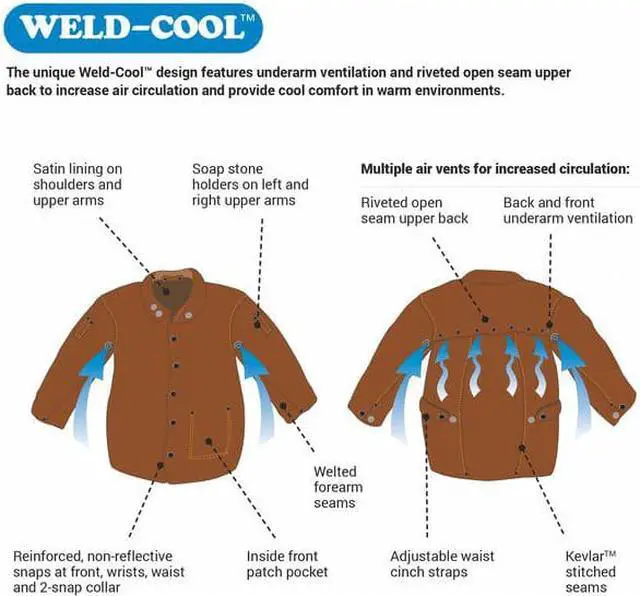 ANSI Class Not Rated, Closure Type Snaps, Collar Style Stand Up/Roll Down, Color Brown, Fabric Weight 9 oz, Fall Protection Compatible No, Features Adjustable Waist Cinch Straps for Comfort and Fit, and Collar, Inside Pocket Prevents Spatter From Burning Through Pocketed Items, Lock Stitched with Flame Resistant Kevlar (R) Thread, Non-Reflective and Reinforced Snaps Along Front Closure, Rivet Rei, Wrist, Gender Men's, Heat Protection Type Flames, Metal Spatter, Sparks, High-Visibility No. This item has been restricted from sale in the following state (s): []