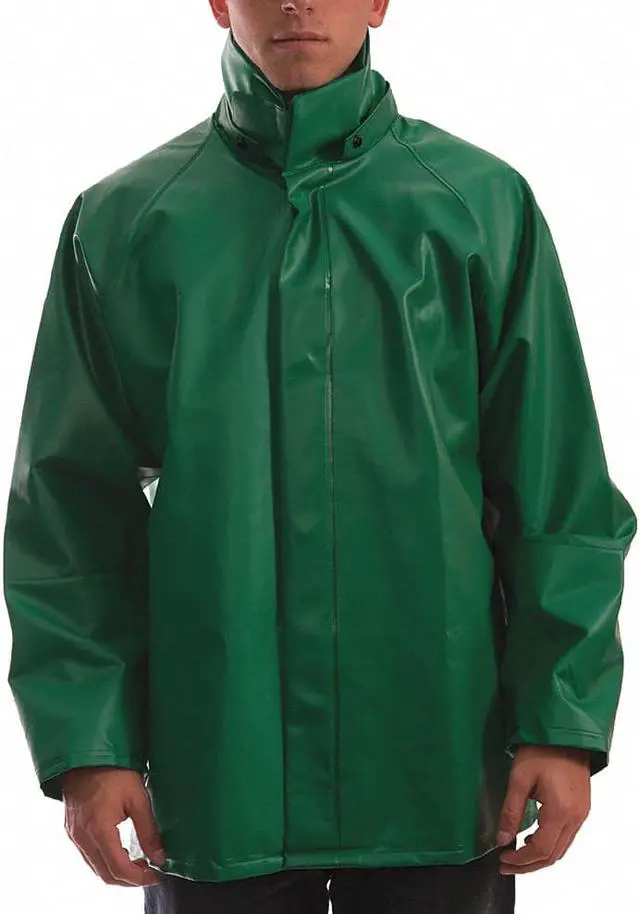 California Proposition 65: This product contains a chemical known to the State of California to cause birth defects or other reproductive harm. Flame Resistant Rain Jacket, Garment Type Rain Jacket, Style Rain Jacket, Size 3XL, Number of Inside Pockets 0, Number of Outside Pockets 0, Color Green, Front Closure Type Snaps with Storm Flap, Gender Unisex, Material Heavy Duty PVC, High-Visibility No, ANSI Class Not Rated, Insulated for Cold Conditions No, Back Stripe Pattern None, Includes Hood No, Hood Style Detachable, Length 32 in, Length Type Hip, Includes Removable Liner No, Includes Lining Yes, Maximum Chest Size 66 in. This item has been restricted from sale in the following state (s): []