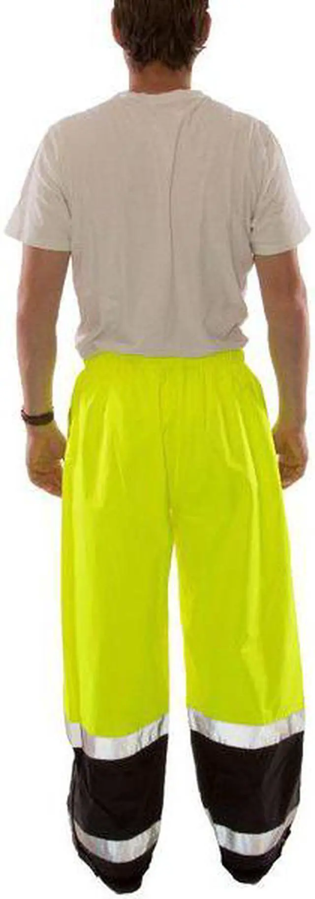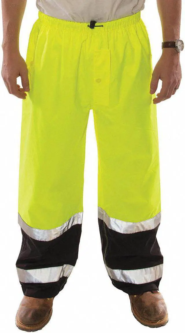 High-Visibility Pants, ANSI Class E, Gender Men's, Style High Visibility Pants, Color Black; Green; Yellow, Material Polyurethane, Waist Closure Pull On, Leg Fit Straight Leg, Number of Outside Pockets 2, Fly Closure Type Snap, Fabric Weight 75 den, Includes Lining Yes, Insulated for Cold Conditions No, Inseam 33 in, Maximum Waist Size 62 in, Minimum Waist Size 60 in, Size 5XL, Reflective Tape Type Glass Bead, Reflective Stripe Border Type None, Garment Features Black Cuffs. This item has been restricted from sale in the following state (s): []