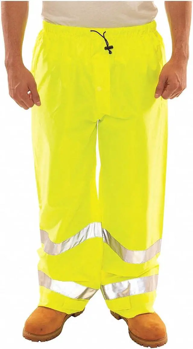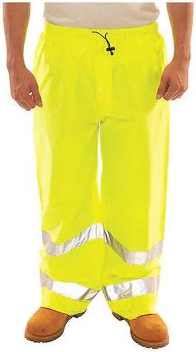 High Visibility Rain Pants, Material Polyurethane, Gender Unisex, Size 3XL, Color Green/Yellow, Inseam 32 in, Maximum Waist Size 54 in, High-Visibility Yes, ANSI Class E, ANSI Type R, Number of Outside Pockets 0, Includes Lining Yes, Lining Material Polyester, Ankle Type Hook-and-Loop, Take-Up Straps, Fabric Weight 4 oz, Thickness 7 mil, Style Rain Pants, Fly Closure Type Snap, Storm Flap, Insulated for Cold Conditions No, Waist Closure Drawstring, Reflective Stripe Border Type None. This item has been restricted from sale in the following state (s): []