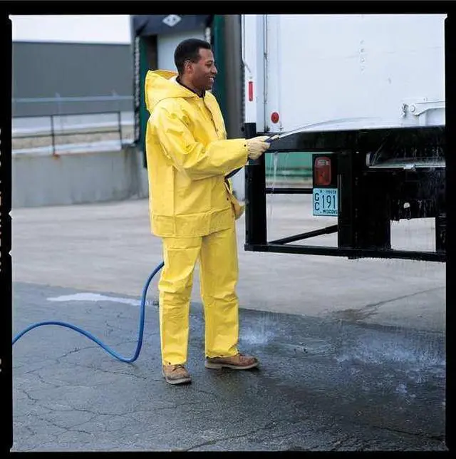 California Proposition 65: This product contains a chemical known to the State of California to cause birth defects or other reproductive harm. 3-Piece Rainsuit with Detachable Hood, Color Yellow, Material PVC, Hood Style Snap-On (Included), ANSI Class Not Rated, High-Visibility No, Size 2XL, Jacket Length 32 in, Fly Closure Type Snaps, Style 3-Piece Rain Suit with Jacket, Detachable Hood, and Bib Overalls, Includes Lining Yes, Lining Material PVC, Thickness 0.2 mm, Features Wind Resistant, Will Fit Over Boots Yes, Includes Hood Yes, Hood Features Drawcord, Number of Coat Pockets 0, ANSI Type Unrated, Number of Pants Pockets 0