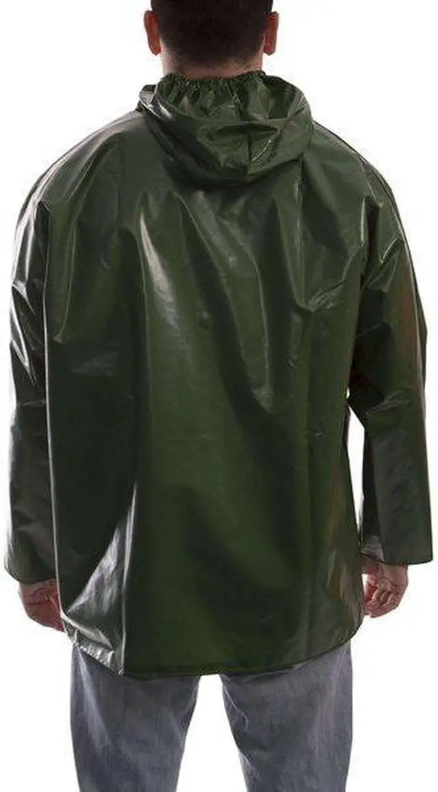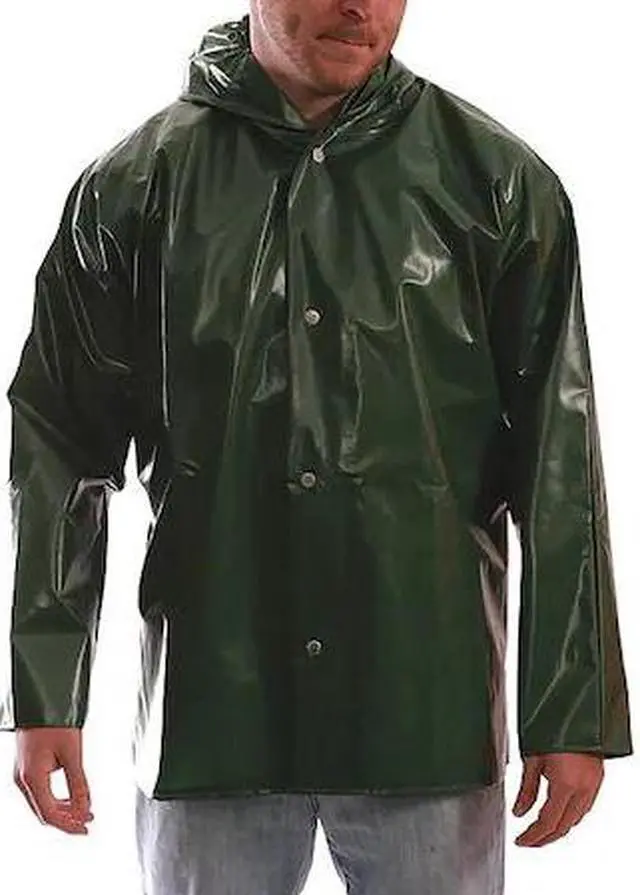 Rain Jacket with Hood, Garment Type Rain Jacket, Style Rain Jacket, Size 2XL, Number of Inside Pockets 0, Number of Outside Pockets 0, Color Green, Front Closure Type Snaps with Storm Flap, Gender Unisex, Material Nylon/Polyurethane, High-Visibility No, ANSI Class Not Rated, Insulated for Cold Conditions No, Back Stripe Pattern None, Includes Hood Yes, Hood Style Attached, Length 32 in, Length Type Hip, Includes Removable Liner No, Includes Lining Yes, Maximum Chest Size 54 in