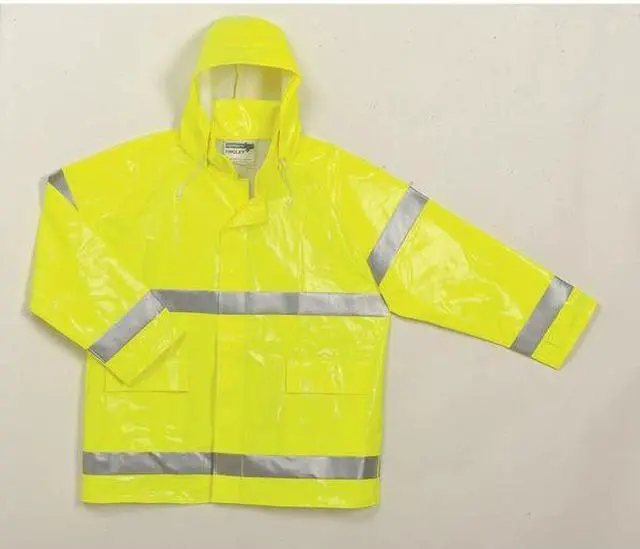 California Proposition 65: This product contains a chemical known to the State of California to cause birth defects or other reproductive harm. Rain Jacket, Garment Type Rain Jacket, Style Rain Jacket, Size 2XL, Number of Inside Pockets 0, Number of Outside Pockets 2, Color Green/Yellow, Front Closure Type Zipper with Storm Flap, Gender Unisex, Material PVC, High-Visibility Yes, Insulated for Cold Conditions No, Back Stripe Pattern U, Includes Hood Yes, Hood Style Packable Hood in Collar, Length 32 in, Length Type Hip, Includes Removable Liner No, Includes Lining Yes, Maximum Chest Size 62 in, Lining Material Polyester. This item has been restricted from sale in the following state (s): []