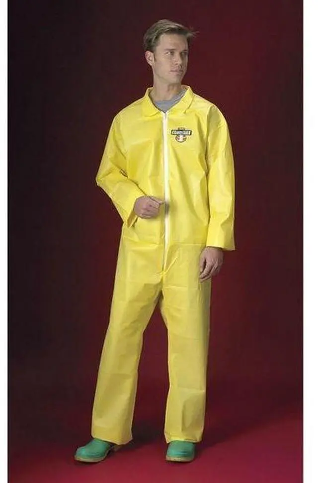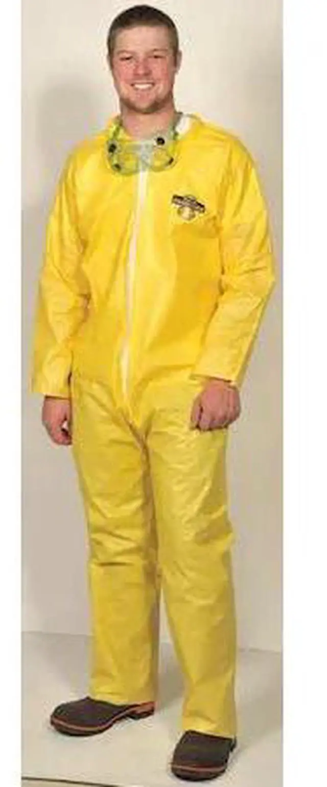 Collared Chemical Resistant Coveralls, Ankle Closure Open, Closure Features Zipper, Closure Type Zipper, Color Yellow, Coverall Style Collared Coverall, Cuff Style Open, Hazard Type Hazardous Dry Particulates, Hazardous Liquids