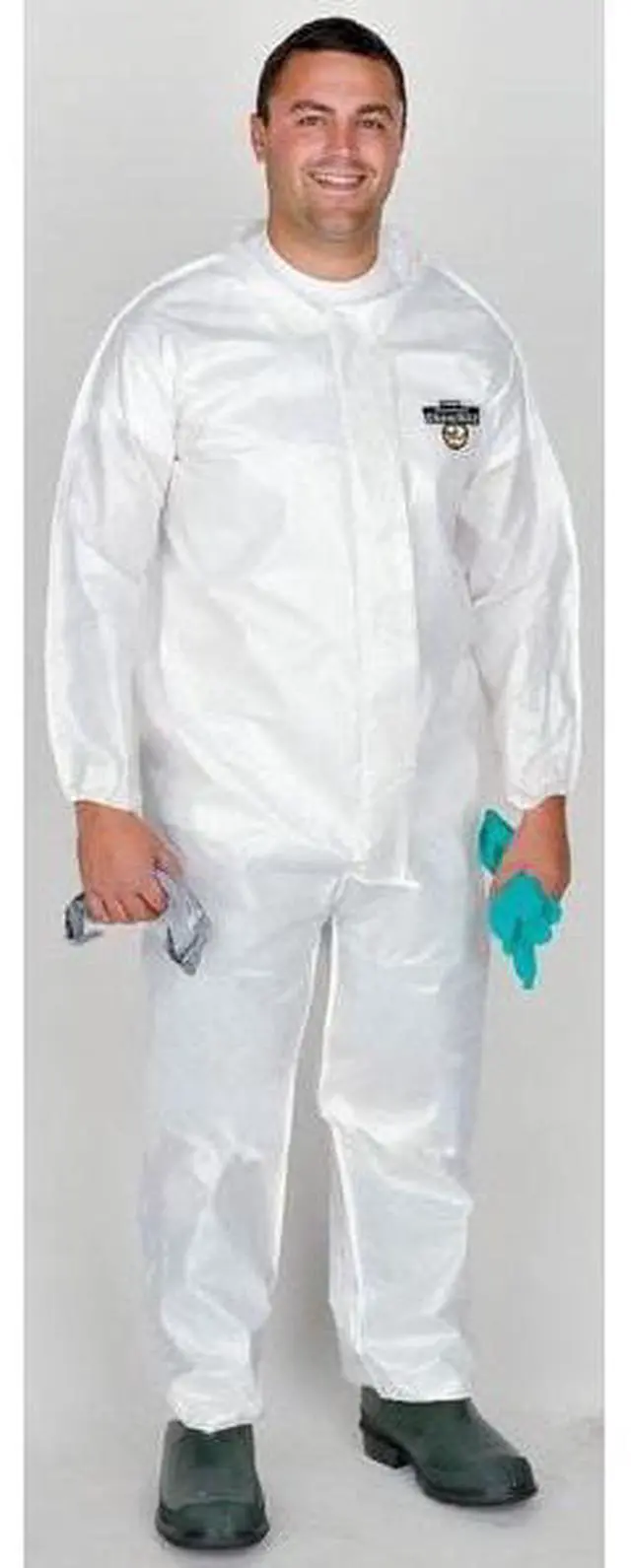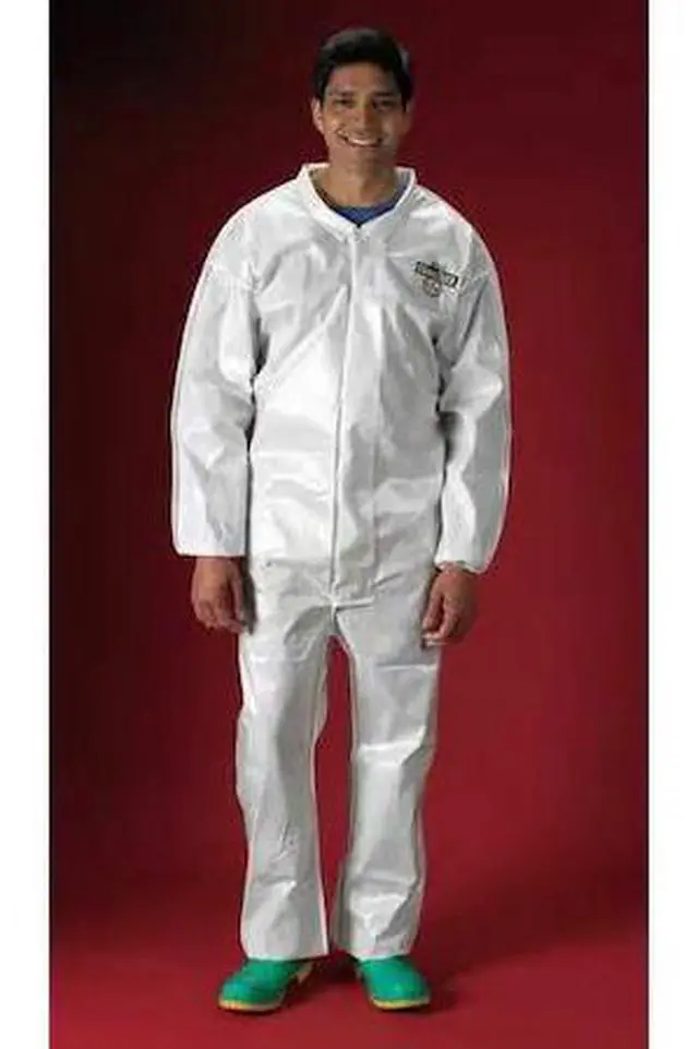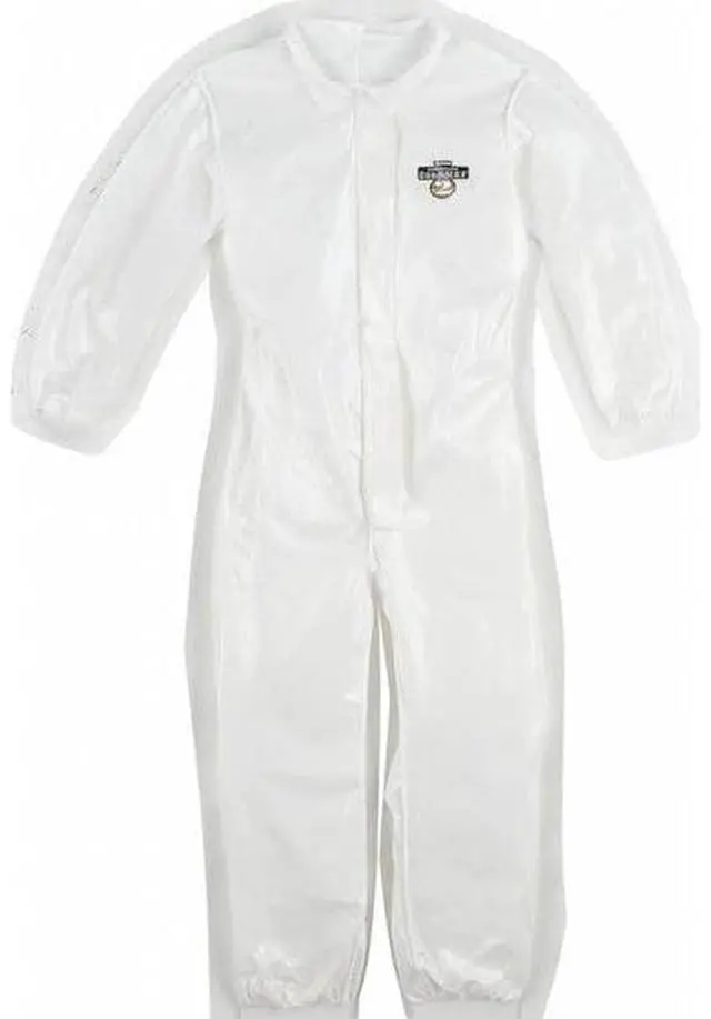 Collared Chemical Resistant Coveralls, Ankle Closure Elastic, Closure Type Zipper, Color White, Coverall Style Collared Coverall, Cuff Style Elastic, Hazard Type Hazardous Dry Particulates, Hazardous Liquids