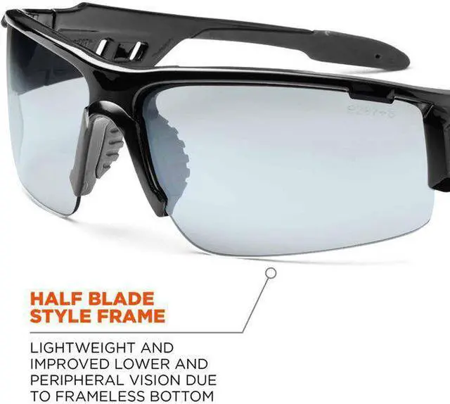 Dagr Safety Glasses: Sleek half frame blade style safety glasses. Rubber co-injection temples and non-slip nose piece. (The Norse God of Sunrise. Wake up and see the Universe.)