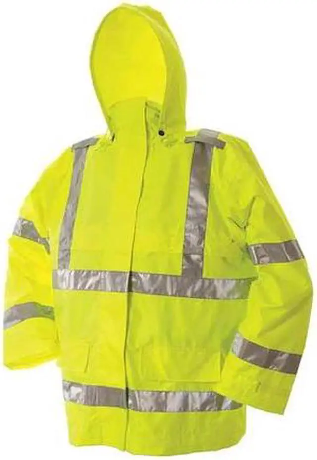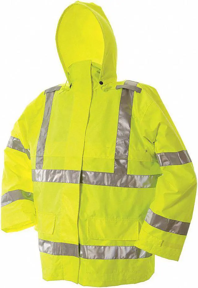 Hi-Viz Safety Jacket, Style Rain Jacket, Size M, Number of Inside Pockets 0, Number of Outside Pockets 2, Color Green, Front Closure Type Double Storm Flap, Hook-and-Loop, Zipper, Gender Men's, Material Polyester, Polyurethane, High-Visibility Yes, Includes Hood Yes, Hood Style Detachable, Length 30 1/2 in, Includes Lining Yes, Maximum Chest Size 40 in, Lining Material Polyester, Features Wind Resistant, Standards ANSI/ISEA 107-2015, Cuff Style Hook-and-Loop, ANSI Type R. This item has been restricted from sale in the following state (s): []