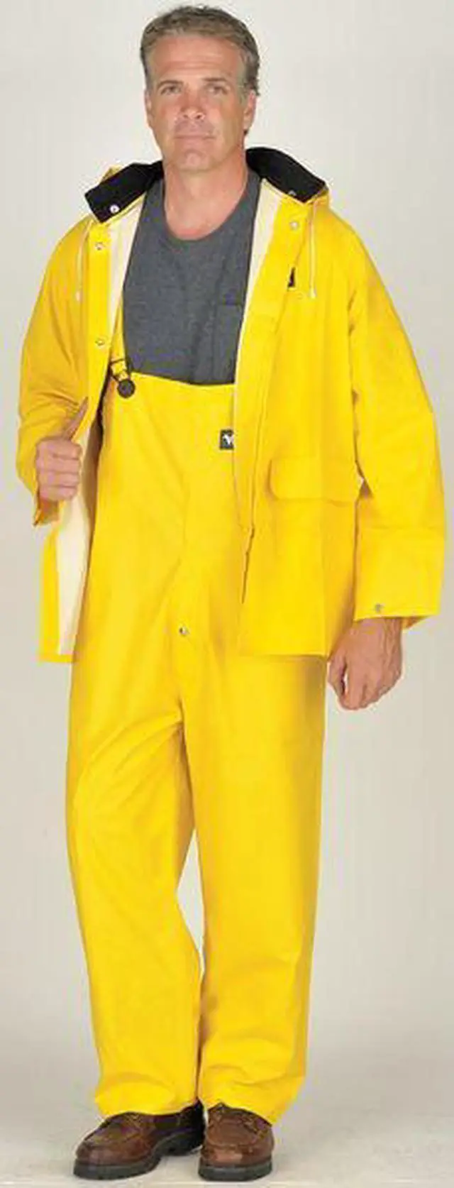 California Proposition 65: This product contains a chemical known to the State of California to cause birth defects or other reproductive harm. 3-Piece Rainsuit with Detachable Hood, Color Yellow, Material Polyester, PVC, Hood Style Detachable, ANSI Class Not Rated, High-Visibility No, Size XL, Jacket Length 32 in, Fly Closure Type Snaps, Style 3 Piece Rain Suit with Jacket/Bib Overall, Includes Lining Yes, Lining Material Polyester, PVC, Thickness 0.35 mm, Features Water Resistant, Wind Resistant, Includes Hood Yes, Hood Features Drawstring Closure, Number of Coat Pockets 2, ANSI Type Unrated, Jacket Entry Closure Type Snaps. This item has been restricted from sale in the following state (s): []
