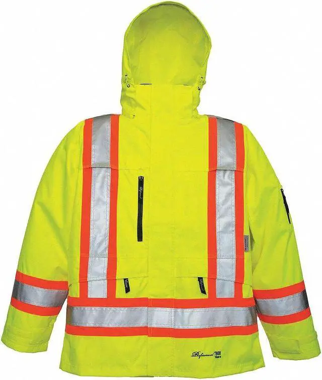 Rain Jacket with Detachable Hood, Style Rain Jacket, Size 3XL, Number of Inside Pockets 4, Number of Outside Pockets 1, Color Yellow/Green, Front Closure Type Hook-and-Loop, Zipper, Gender Men's, Material 300 Denier Trilobal Rip-Stop Polyester, Waterproof Breathable, High-Visibility Yes, ANSI Class Class 3, Type R, Includes Hood Yes, Hood Style Detachable, Length 33 in, Lining Material Polyester/ PU Backing, Features Cold Weather, Wind Resistant, Standards ANSI 107-2015, Cuff Style Hook-and-Loop. This item has been restricted from sale in the following state (s): []