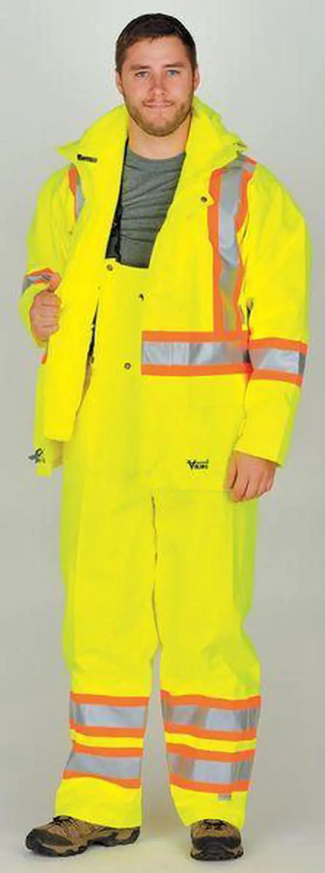 Rain Coat with Detachable Hood, Style Rain Jacket, Size XL, Number of Inside Pockets 2, Number of Outside Pockets 0, Color Yellow/Green, Front Closure Type Hook-and-Loop, Zipper, Gender Men's, Material 300 Denier Polyester/PVC with 260g Polyester Fleece Liner, High-Visibility Yes, ANSI Class Class 3, Type R, Includes Hood Yes, Hood Style Detachable, Length 33 in, Lining Material Polyester/PVC, Features Cold Weather, Wind Resistant, Standards ANSI 107-2010, Cuff Style Hook-and-Loop. This item has been restricted from sale in the following state (s): []