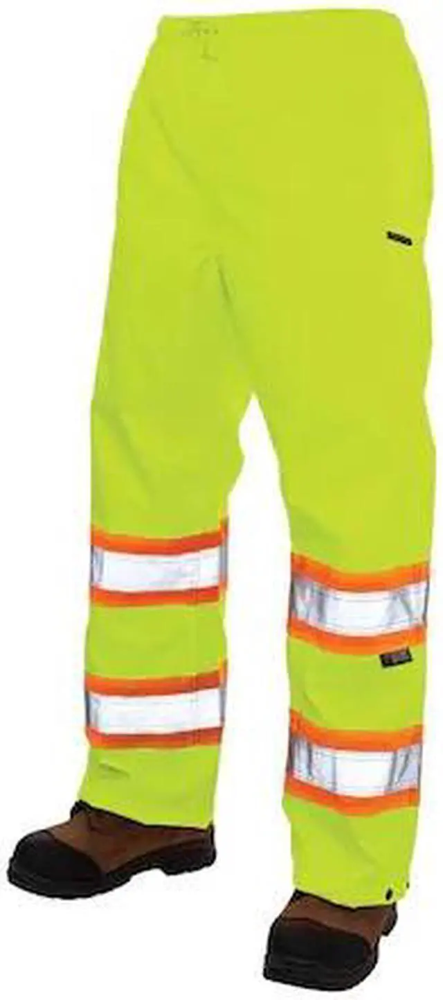 Hi-Visibility Rain Pants, Material 100 Percent Rip-Stop Polyester, Gender Men's, Size XL, Color Gree/Yellow, Inseam 32 in, Maximum Waist Size 42 in, High-Visibility Yes, ANSI Class E, Number of Outside Pockets 2, Ankle Type Snap, Fabric Weight 13.5 oz, Style Rain Pants, Fly Closure Type Drawstring, Elastic, Waist Closure Drawstring, Standards ANSI 107-2015 Class E, Includes TYPE E, Features Wind Resistant. This item has been restricted from sale in the following state (s): []
