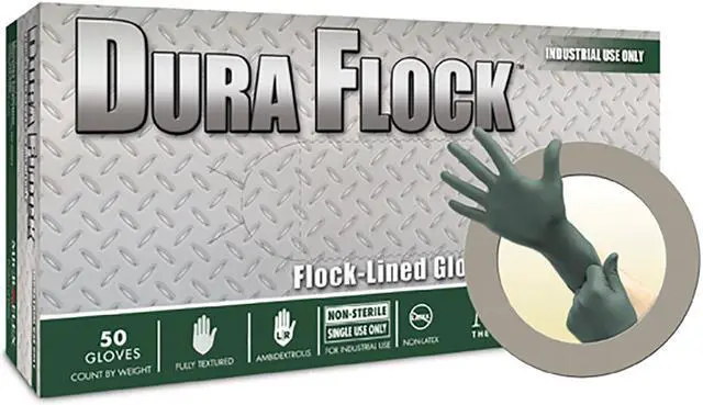 Mircoflex - Dura Flock® Flock Lined Industrial-Grade Nitrile Gloves. Moisture absorbing flock-lining keeps hands dry in industrial applications. 25% thicker than standard gloves. Longer cuff for increased protection. Fully textured surface. 50 gloves per box. 10 boxes per case. Size=X-Large, Pack Qty. =50/box