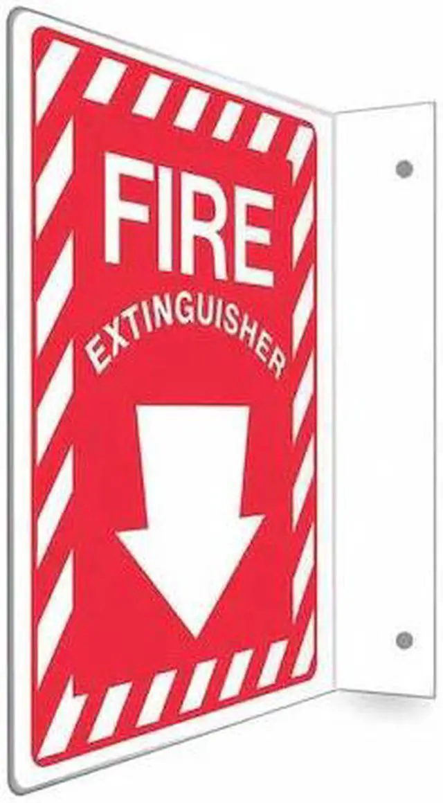 High Visibility Safety Sign, L-Shape Projection, Number of Printed Sides 2, English, Sign Legend Fire Extinguisher, Sign Legend Background Color Red, Sign Legend Style Symbol and Text. This item has been restricted from sale in the following state (s): []