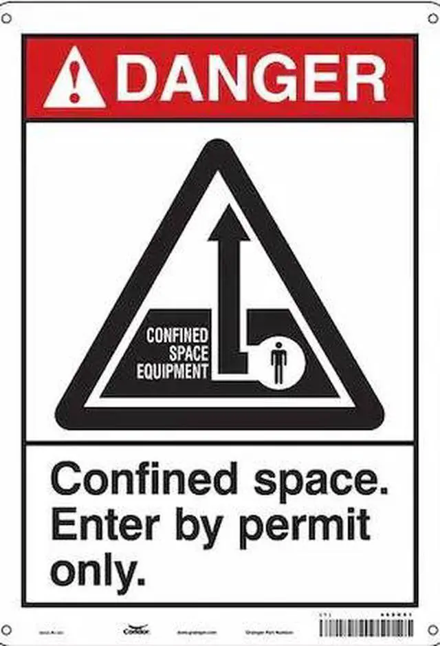 Safety Sign, Vertical Rectangle, Number of Printed Sides 1, English, Sign Format ANSI/OSHA Format, Sign Legend Confined Space. Enter By Permit Only., Sign Legend Background Color White, Sign Legend Style Symbol and Text