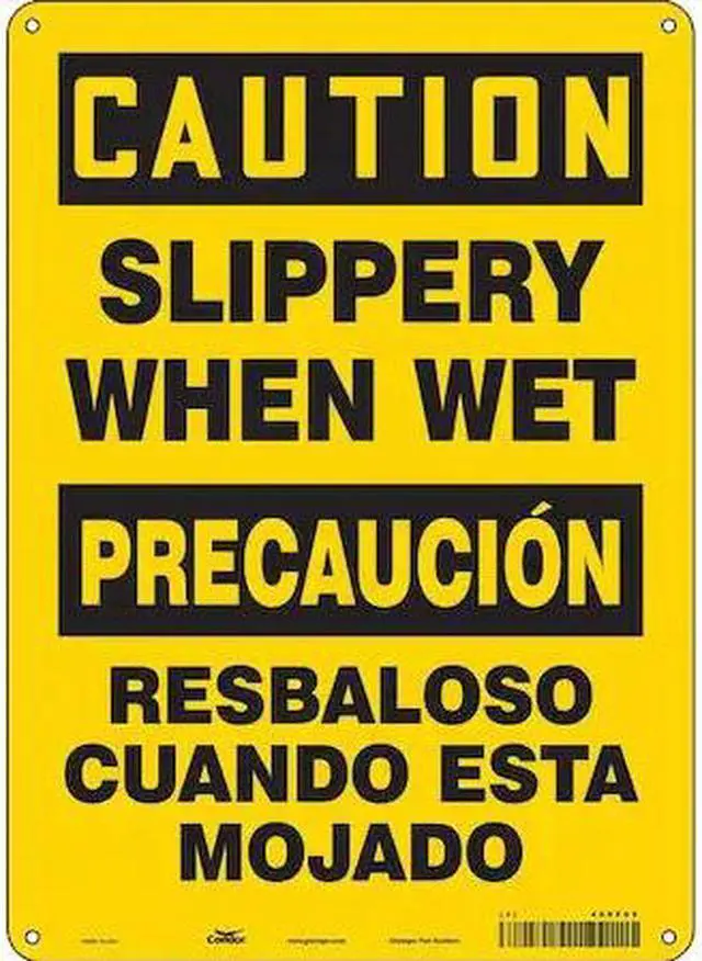 Safety Sign, Vertical Rectangle, Number of Printed Sides 1, English, Spanish, Sign Format Traditional OSHA, Sign Legend Slippery When Wet/Resbaloso Cuando Esta Mojado, Sign Legend Background Color Yellow, Sign Legend Style Text