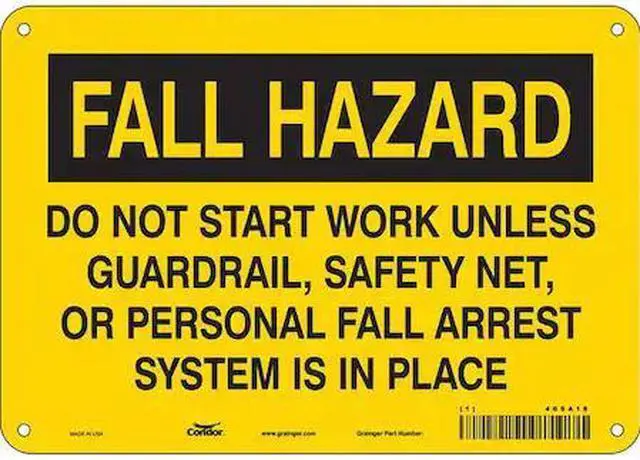 California Proposition 65: This product contains a chemical known to the State of California to cause birth defects or other reproductive harm. Safety Sign, Vertical Rectangle, Number of Printed Sides 1, English, Sign Format Other Format, Sign Legend Fall Hazard Do Not Start Work Unless Guardrail, Safety Net, Or Personal Fall Arrest System Is In Place, Sign Legend Background Color Black, Yellow, Sign Legend Style Text