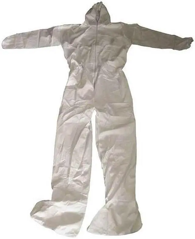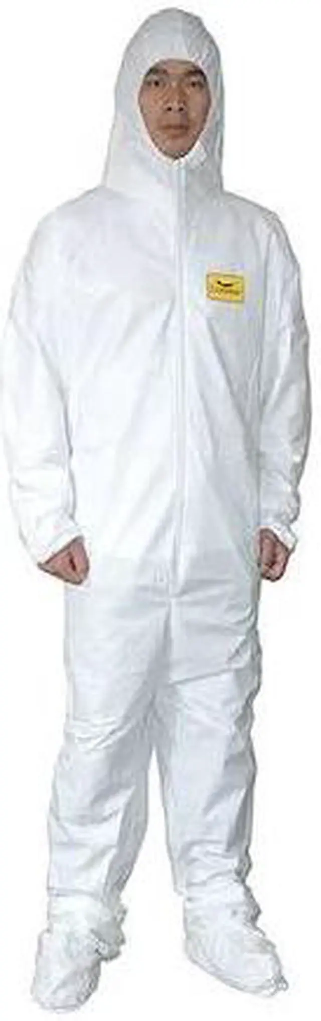Disposable Coveralls, Ankle Closure Attached Boots, ANSI 107 Performance Class Not Applicable, Anti-Static No, Attached Glove Material Not Applicable, Attached Glove Style Not Included, Attached Hood Yes, Breathable Back Style Not Applicable, Chest Size - Maximum 48 3/4 in, Chest Size - Minimum 45 1/2 in, Clean Process Status Not Clean Processed, Closure Features Zipper, Closure Type Zipper, Collar Style Not Applicable, Color White, Coverall Style Hooded, Cuff Style Elastic