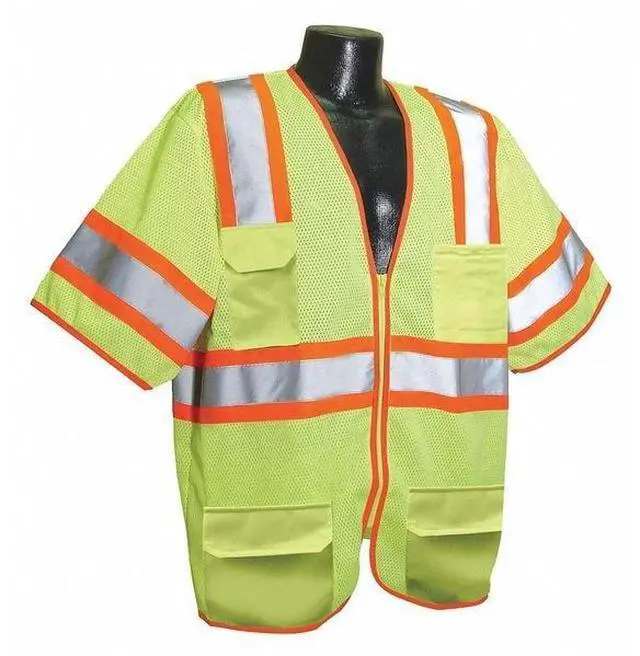 High Visibility Vest, ANSI Class 3, Vest Size 3XL, Traffic Safety Vest Color Yellow/Green, Fits Chest Size 56 in to 58 in, Gender Unisex, Stripe Color Silver, Vest Material Polyester Mesh, Vest Closure Type Zipper, ATPV Rating Not Rated, Hazard Risk Category (HRC) Not Applicable, Vest Stripe Color Family Silver, Back Stripe Pattern U-Block, Vest Length 29 in, Number of Pockets (Inside) 1, Number of Pockets (Outside) 4, Number of Pockets with Closure 5, Features 360 Degrees Visibility. This item has been restricted from sale in the following state (s): []