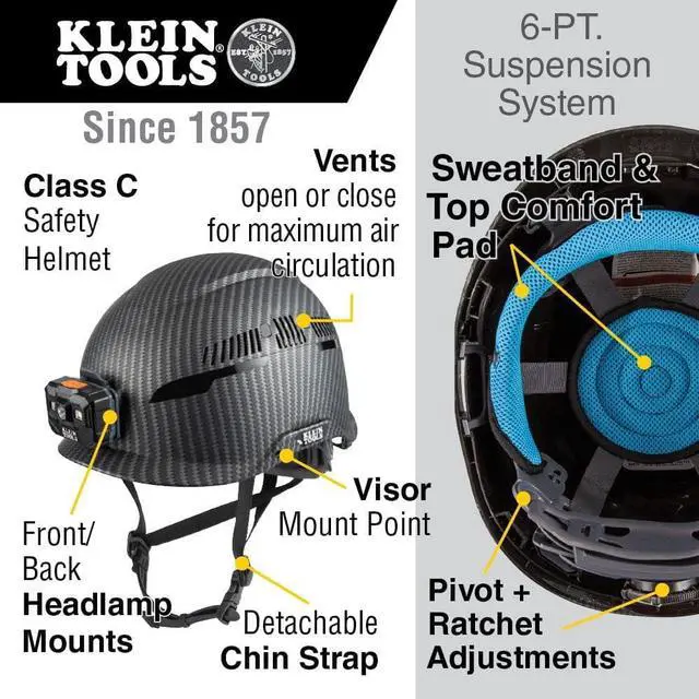 Patent-pending accessory mounts on front and back ensure Klein Headlamps and other accessories attach securely and precisely every time; no straps or zip ties needed