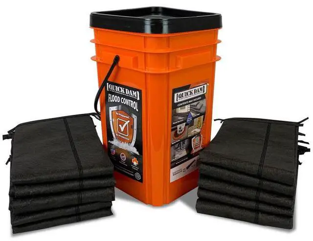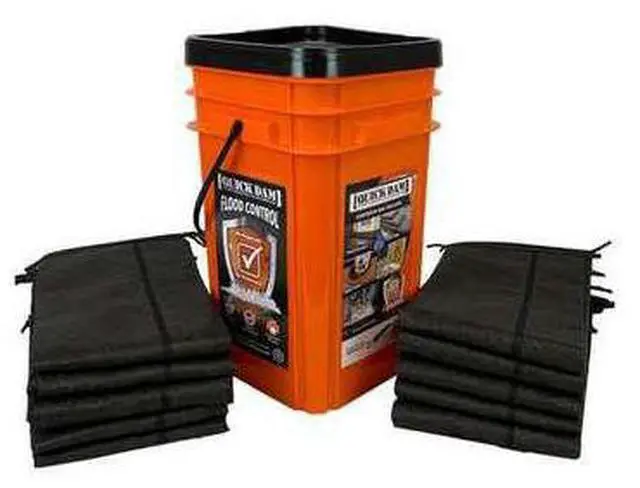 Flood Barrier Emergency Kit, Closed, Material Polypropylene, Thickness 14 in, Height 15 in, Length 5 ft, Width 14 in, Weight Capacity 15 lb, Includes Bucket containing 10 - 5ft Flood Barriers, For Water Type Freshwater, Package Quantity 10. This item has been restricted from sale in the following state (s): []