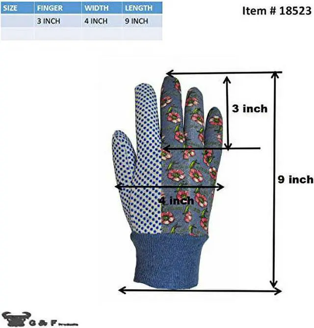 G & F Work Gloves in size M come in a set of 3 pairs, showcasing our commitment to quality and constant improvement of gardening experience through our Micro foam Women Garden Gloves. The gloves are made of 100% cotton soft jersey material and feature a charming flower print with knot wrist to prevent dirt from entering, while PVC dots add an extra grip. The gloves are designed to fit all hand sizes. The foamed latex coating makes them sturdy yet soft, reducing fatigue, and makes them perfect for landscaping, handling, automotive, logistics, warehousing, and driving.