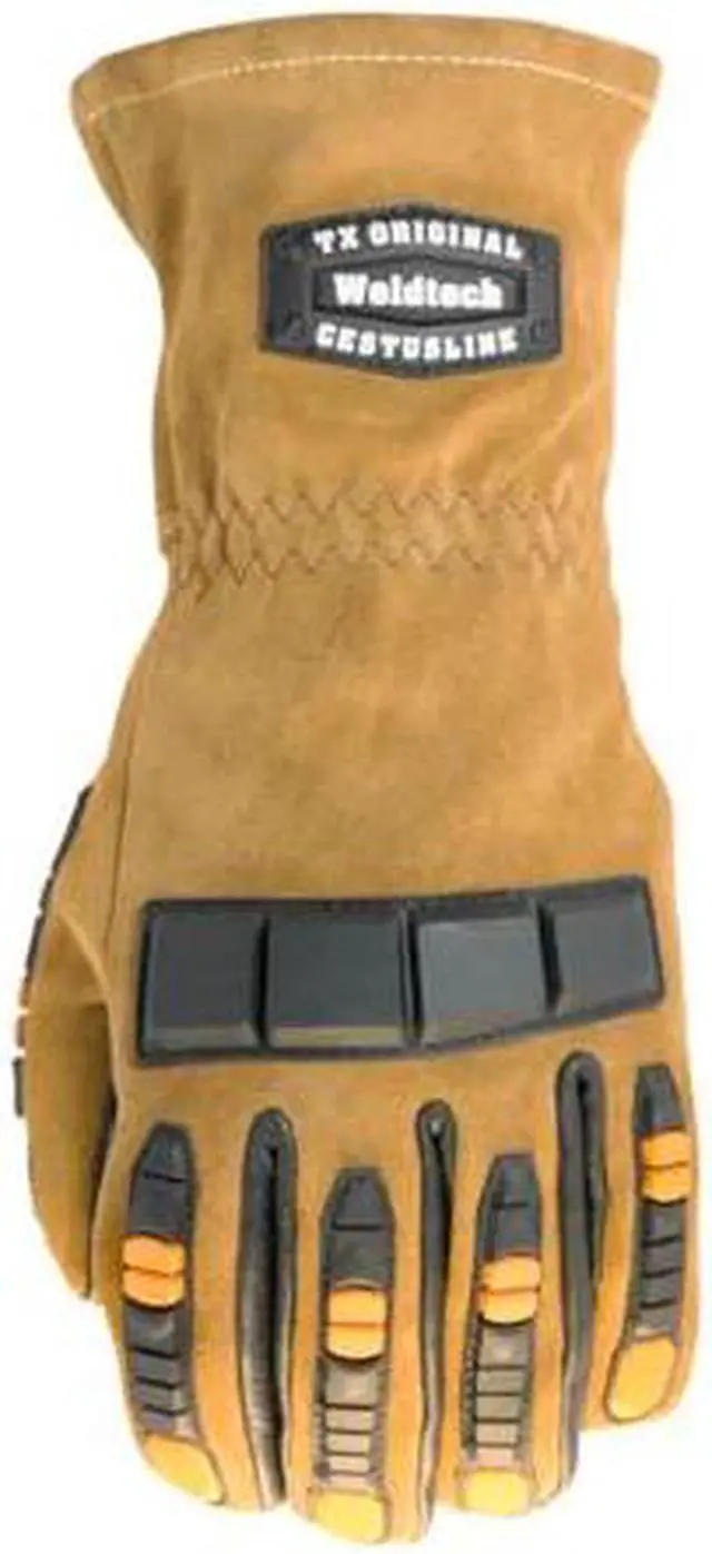 Welders often use multiple tools in addition to their welding equipment, and need multipurpose gloves that they wont have to take off to switch tasks. TheWeldTech TX gloves are designed for a variety of tasks, and feature reliable cowhide leather that adds fire and heat resistance for the entire hand and cuff. Hexagonal Memory Gel® padding in the palm and fingers absorb vibrations from power and impact tools, while the four-layer one-piece palm gives the glove durability in high-wear areas. Segmented Thermoplastic Rubber (TPR) on back of fingers, thumb and knuckles provide impact protection, and adjustable long cuff keeps sparks and debris out of the glove.