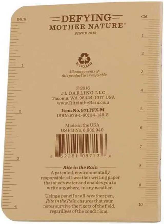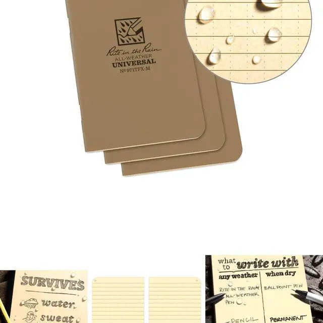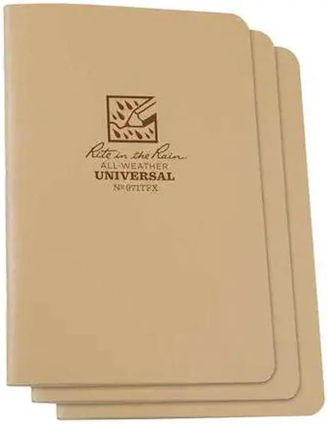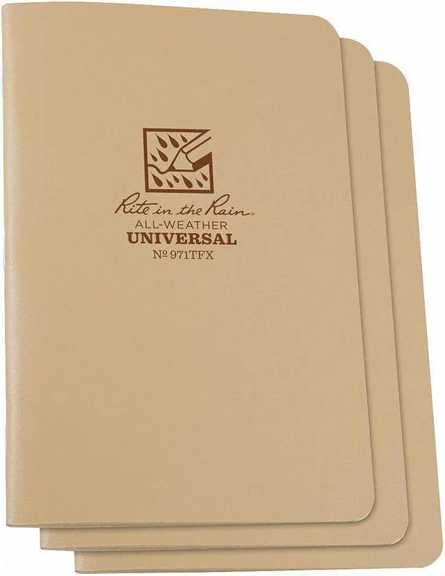 All Weather Notebook, Cover Color Tan, Cover Material Field Flex, Binding Nonwirebound, Backing Polydura, Sheet Size 3-1/4 in x 4-5/8 in, Rule Universal, Paper Color Tan, Paper Weight 32 lb, Standards ANSI/NISO Z 39.48 -1992 (R2002), Package Quantity 3