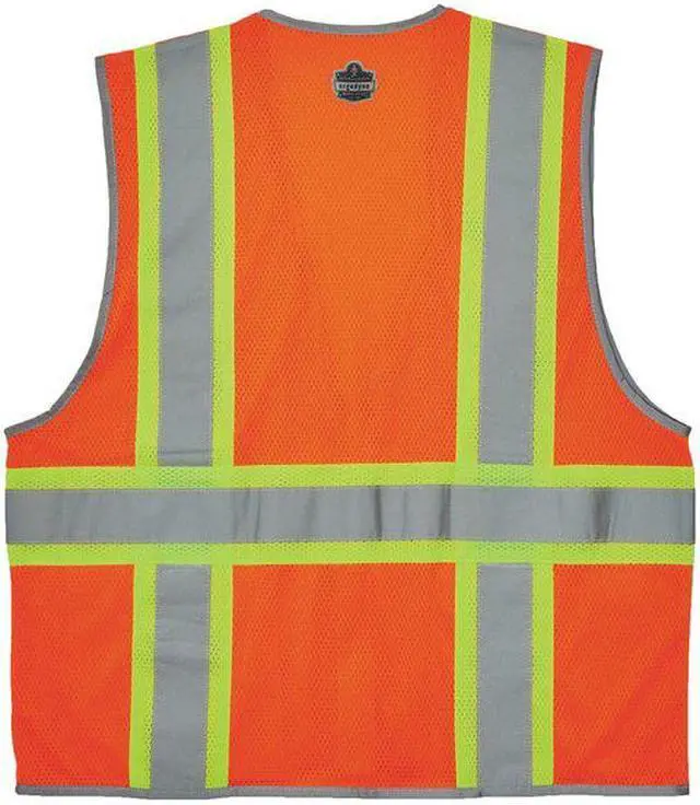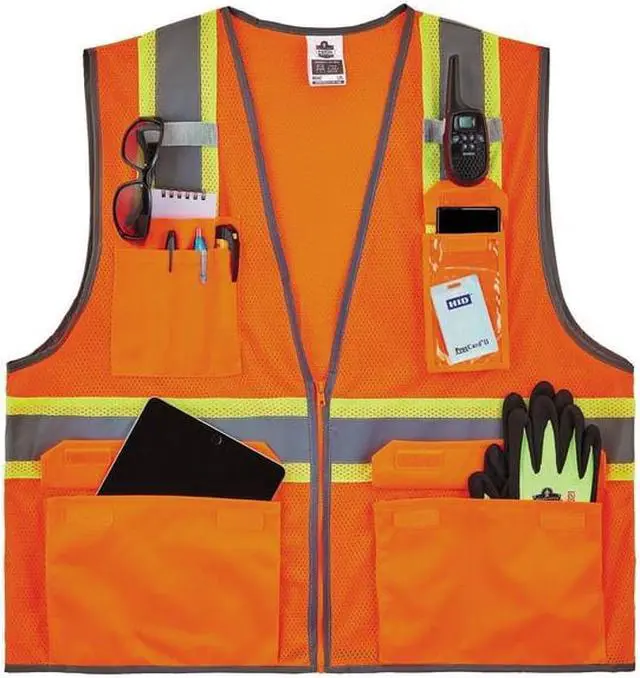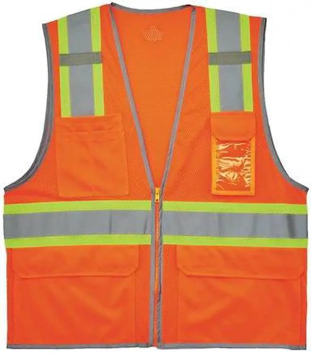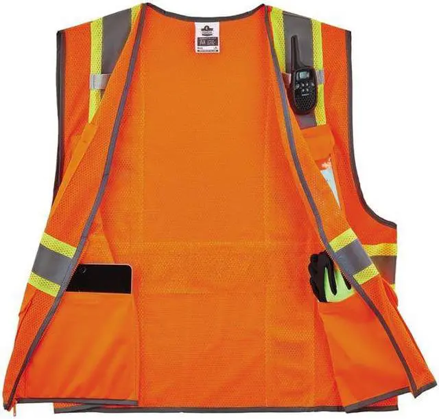 The GloWear® 8246Z-S Mesh Two-Tone Hi-Vis Safety Vest is an ANSI 107 Type R, Class 2 vest made of 3.3oz polyester mesh. This hi-vis vest features 2 reflective tape set on a 3.5 contrasting mesh background and reflective piping for enhanced low-light visibility. Built for storage, this vest has two inside and four outside pockets, a clear ID badge holder and dual radio mic tabs. A zipper closure makes for easy on and off.