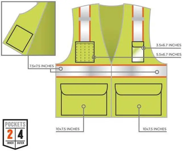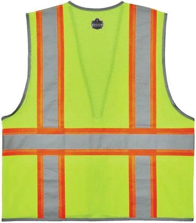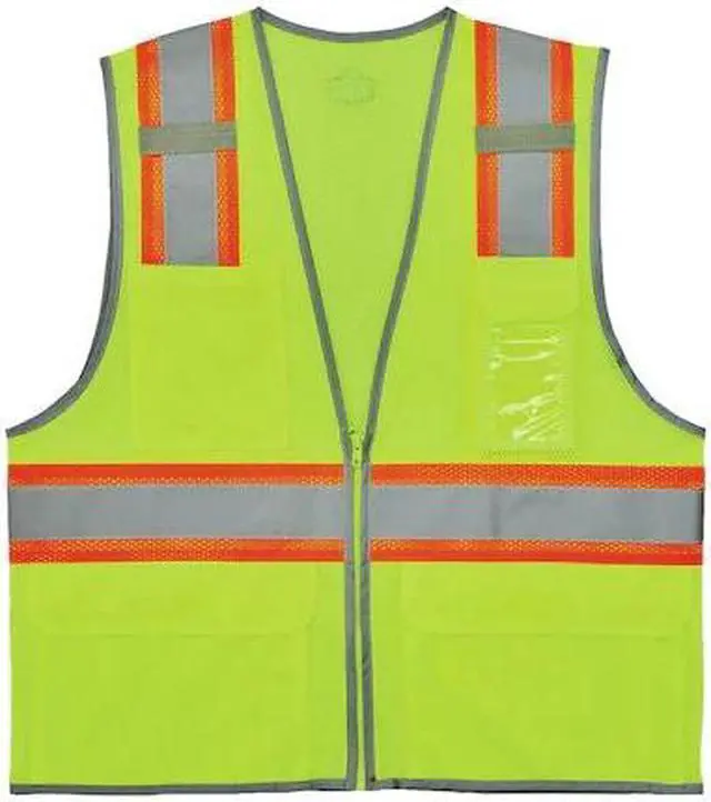 The GloWear® 8246Z-S Mesh Two-Tone Hi-Vis Safety Vest is an ANSI 107 Type R, Class 2 vest made of 3.3oz polyester mesh. This hi-vis vest features 2 reflective tape set on a 3.5 contrasting mesh background and reflective piping for enhanced low-light visibility. Built for storage, this vest has two inside and four outside pockets, a clear ID badge holder and dual radio mic tabs. A zipper closure makes for easy on and off.